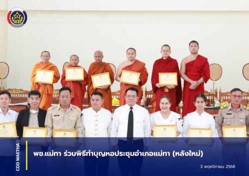 วันจันทร์ ที่ 3 พฤศจิกายน 2568 เวลา 13.30 น. ณ หอประชุมที่ว่าการอำเภอแม่ทา (หลังใหม่) นายวิวัฒน์ อินทร์ไทยวงศ์ ผู้ว่าราชการจังหวัดลำพูน มอบหมายให้ นายโยธิน ประสงค์ความดี รองผู้ว่าราชการจังหวัดลำพูน เป็นประธานในพิธีทำบุญหอประชุมอำเภอแม่ทา (หลังใหม่) โดยมีนายปรีชา สมชัย ปลัดจังหวัดลำพูน นายพงษ์ศักดิ์ อุสาหะพงษ์สิน ปลัดอำเภอหัวหน้ากลุ่มงานบริหารงานปกครอง รักษาราชการแทนนายอำเภอแม่ทา หัวหน้าส่วนราชการ ข้าราชการ พนักงาน ภาคเอกชน กำนัน และผู้ใหญ่บ้านในพื้นที่อำเภอแม่ทา เข้าร่วมพิธีฯ